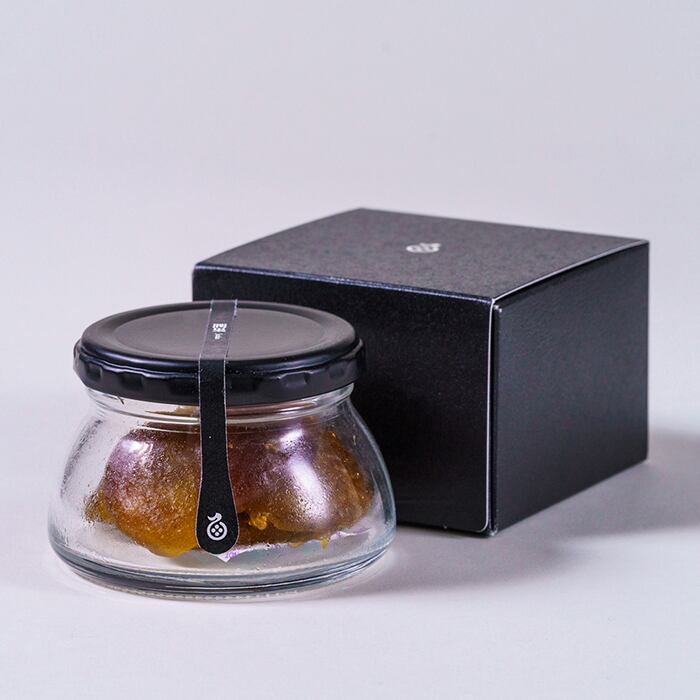 生のいちじくを食べているような食感を残すため、潤果はとよみつ姫を大粒に切り分け、皮付きで果肉のつぶを残しています。果物由来のブドウ糖液糖をつかうことで、体にやさしく、つやのある飴色に仕上がります。